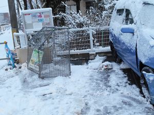 昨日の朝起きたら、車と前にあるごみ箱が大変なことになってました。